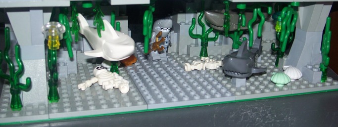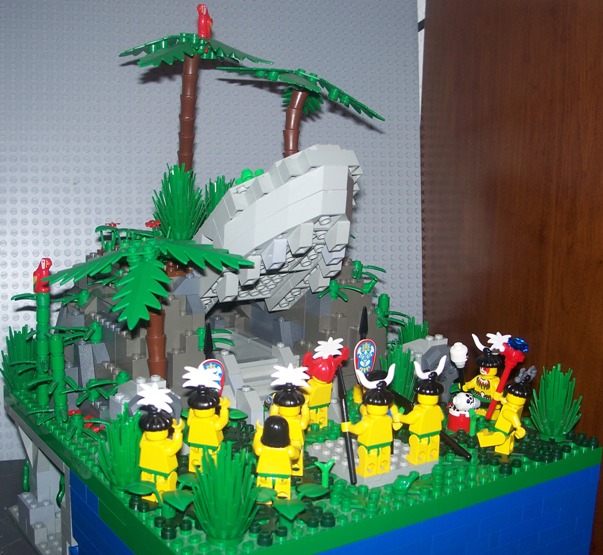 Here we see the Islander king summoning the shark god, the islanders are going to present an offering of fish and a Pirate prisoner. In order to appease the shark god and his sharks, so that the islander will have good fishing.