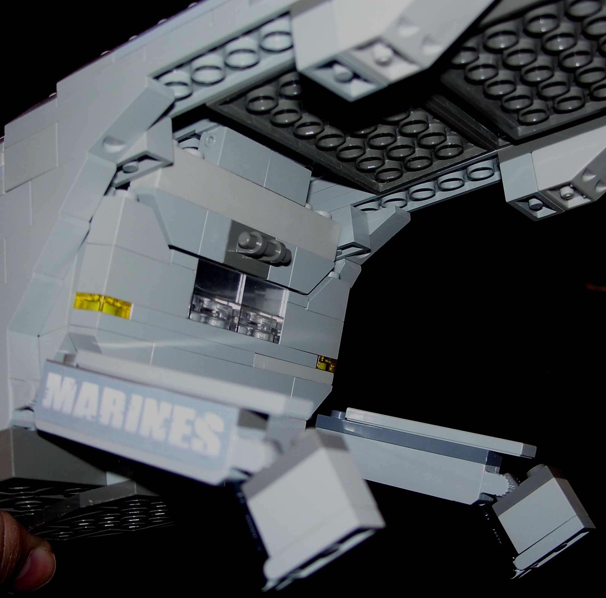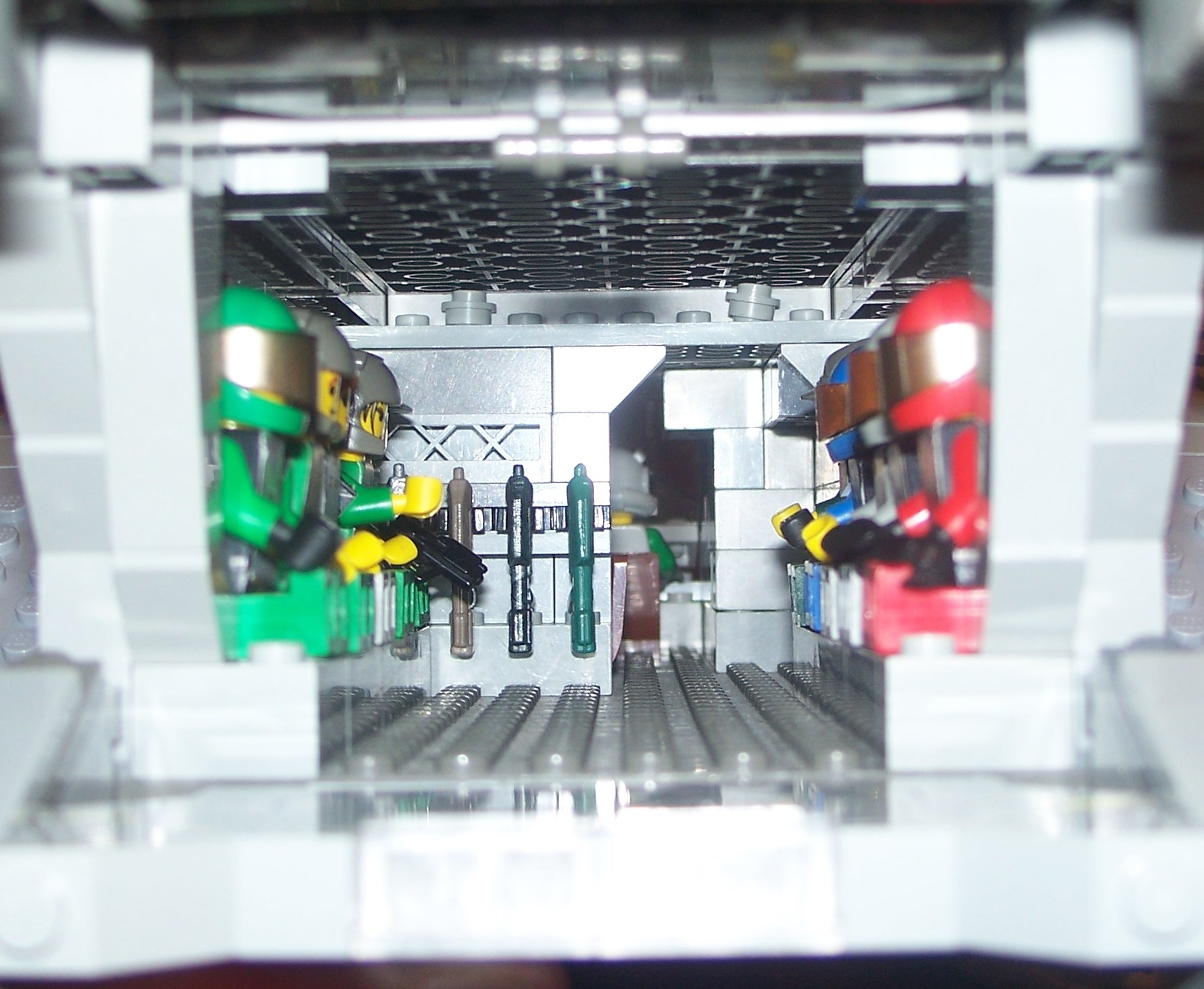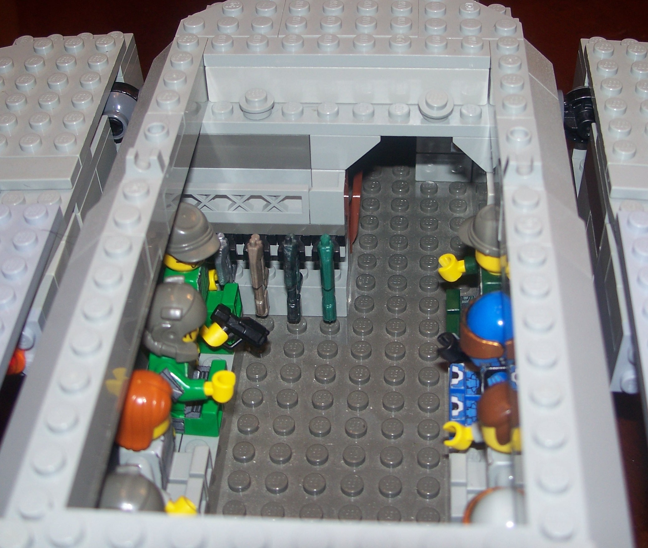 The roof easily comes off, there is a weapons rack, and it can seat up to 10 minifigures. I think my Pelican came out a little on the wide side, but I will eventually make a new one.